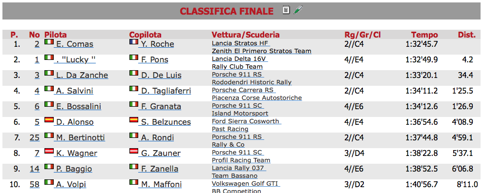 The queen of rally, thanks to Zenith El Primero Stratos Team, got its 4th European title after those won in 76, 77 by Darniche/Mahé and in 78 by Carello/Perissinot.